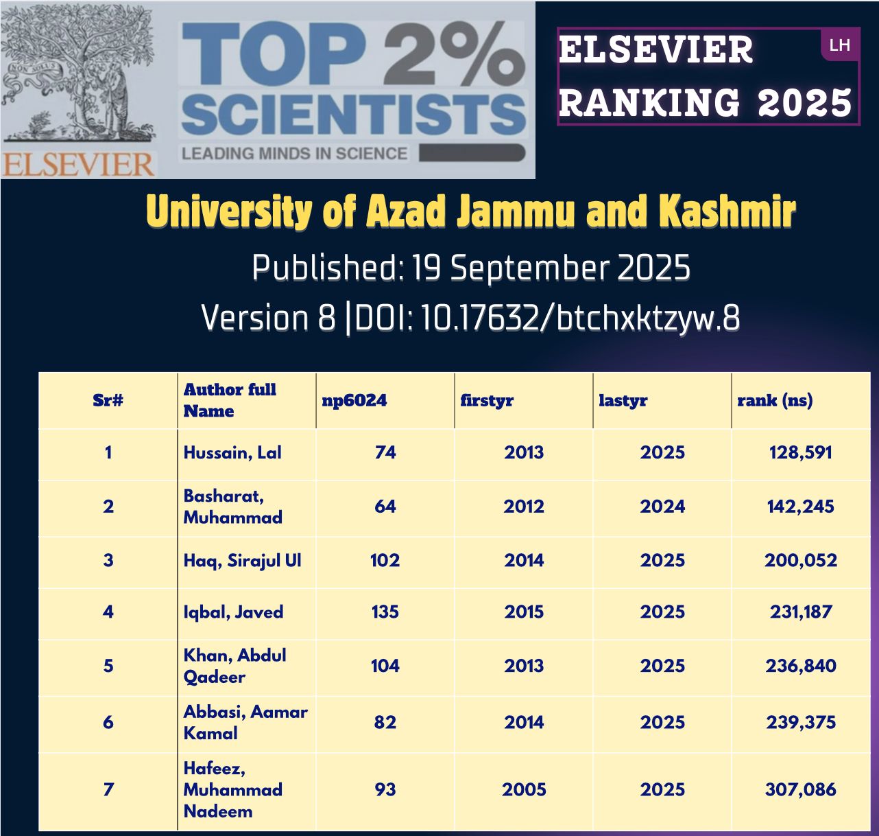 - Congratulations UAJK. – Seven distinguished researchers from the University of Azad Jammu and Kashmir have been ranked among the World’s Top 2% Scientists 2025 by Elsevier.
