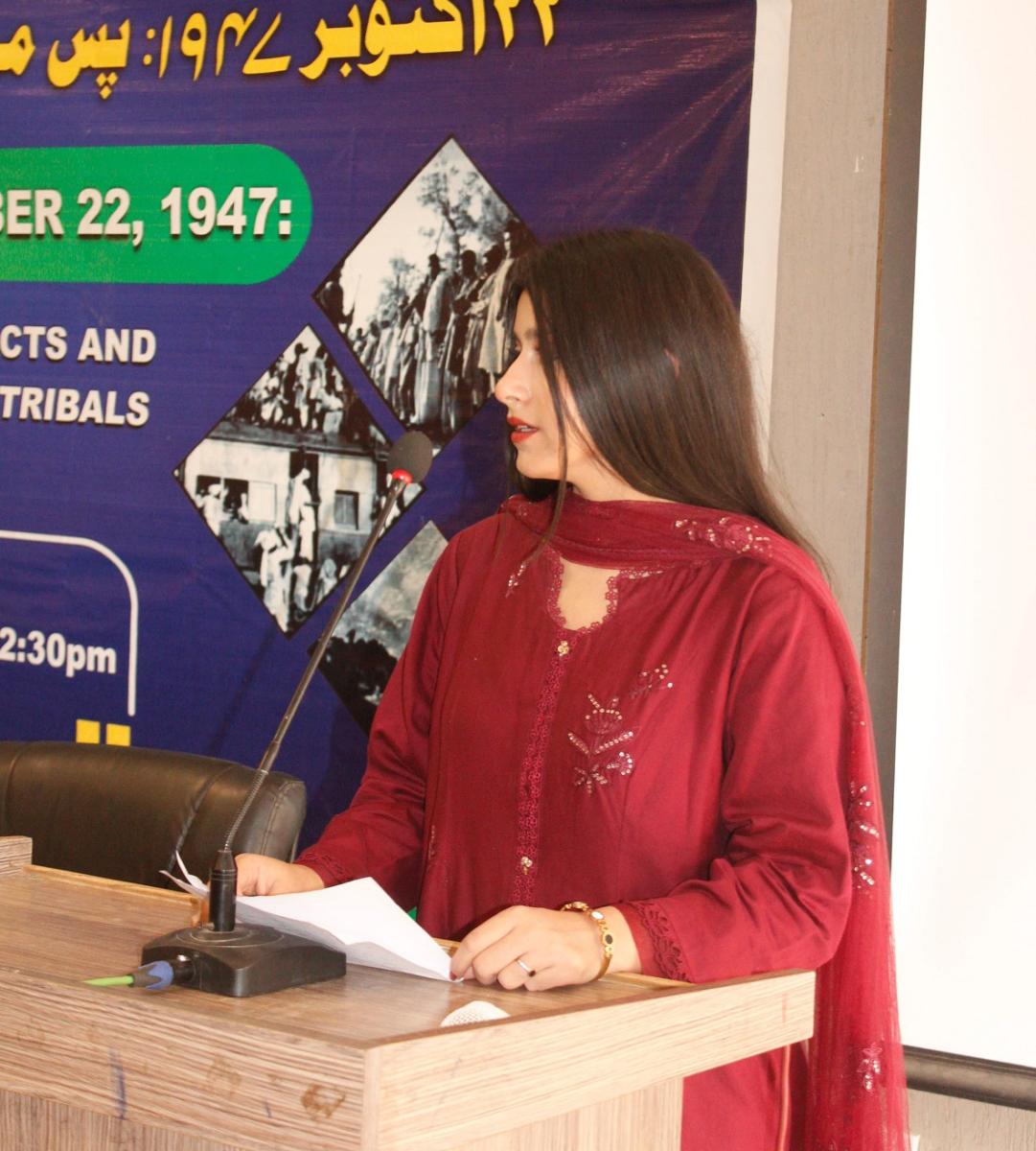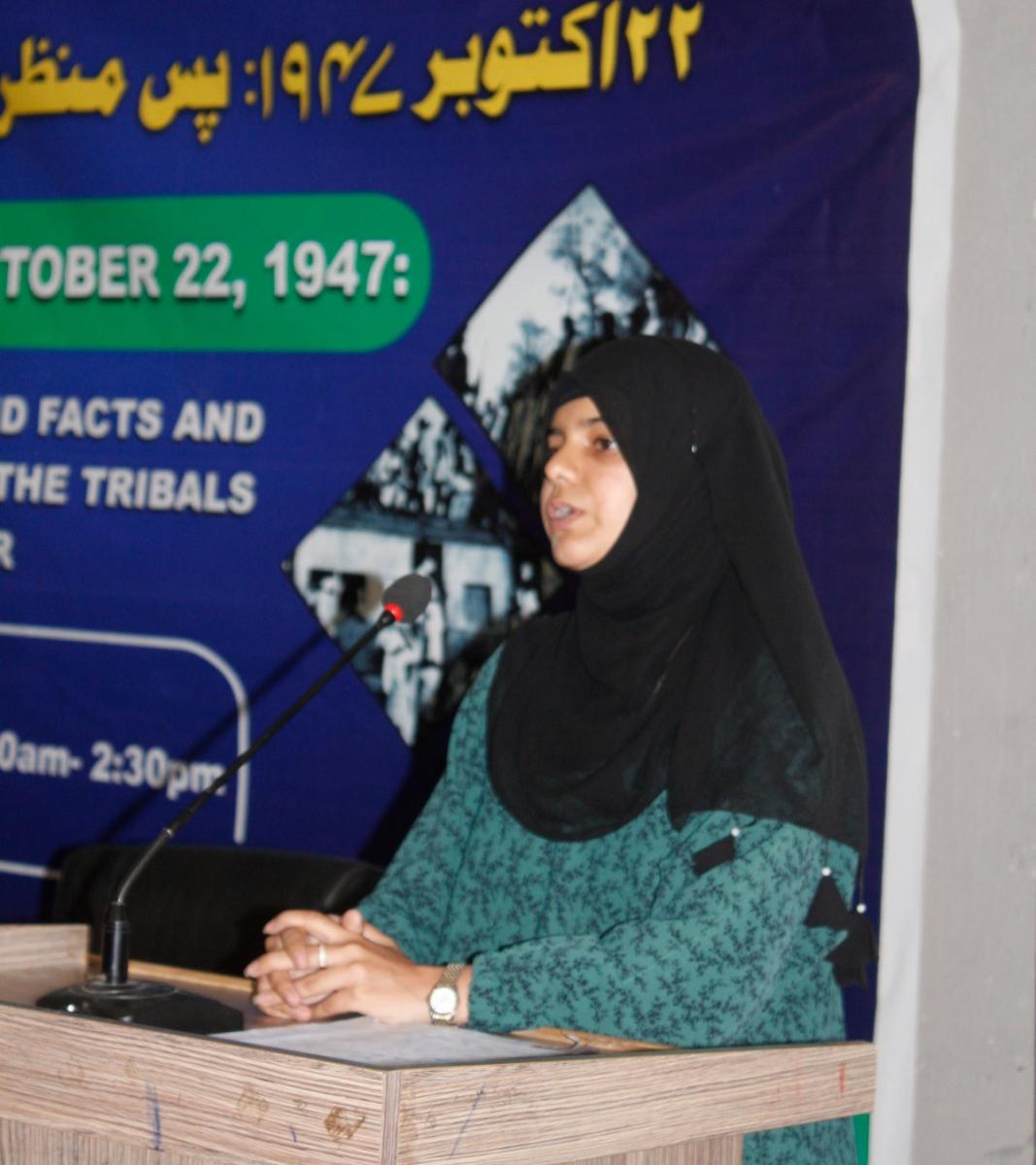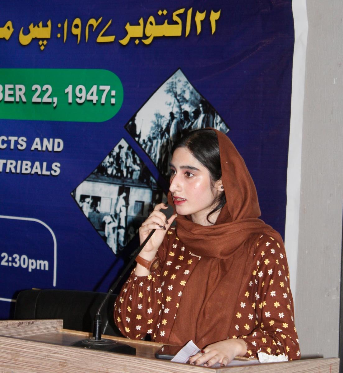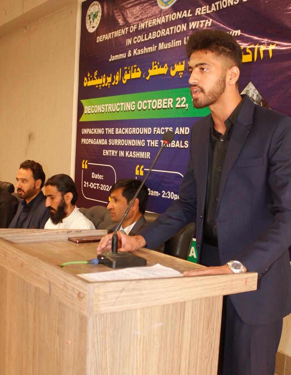 The seminar further featured insightful presentations by 𝐌𝐫. 𝐒𝐢𝐤𝐚𝐧𝐝𝐞𝐫 𝐇𝐚𝐛𝐢𝐛 𝐌𝐢𝐫 𝐚𝐧𝐝 𝐃𝐫. 𝐑𝐚𝐛𝐞𝐞, who meticulously dismantled the myths surrounding October 22, using well-researched facts and independent sources to clarify historical inaccuracies. A group of students from the Department of International Relations—𝐀𝐡𝐭𝐢𝐬𝐡𝐚𝐦 𝐀𝐫𝐢𝐟 𝐊𝐡𝐚𝐧 (BS IR, 8th Semester), 𝐌𝐮𝐛𝐚𝐬𝐡𝐢𝐫 𝐀𝐳𝐢𝐳 (BS IR, 5th Semester), 𝐀𝐧𝐚𝐲𝐚 𝐁𝐮𝐭𝐭 (BS IR, 5th Semester), 𝐙𝐚𝐢𝐧𝐚𝐛 𝐁𝐢𝐛𝐢 (BS IR, 3rd Semester), and 𝐍𝐨𝐨𝐫 𝐔𝐥 𝐄𝐦𝐚𝐧 (BS IR, 3rd Semester)—delivered research presentations on key aspects of the Jammu and Kashmir conflict. They offered detailed analyses on topics such as the Jammu Massacre, the historical context of Kashmir’s freedom struggle, the liberation of Muzaffarabad from an international law perspective, and the issue of settler colonialism in Kashmir.