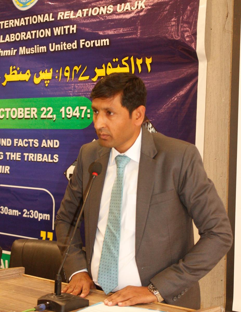 The Department of International Relations at the University of Azad Jammu and Kashmir, in collaboration with the Jammu and Kashmir Muslim United Forum, held an enlightening seminar titled “Deconstructing October 22, 1947: Unpacking the Background Facts and Propaganda Surrounding the Tribal Entry into Kashmir.” This historic event was skillfully hosted by 𝐌𝐫. 𝐀𝐬𝐚𝐝 𝐀𝐥𝐢 𝐁𝐚𝐥𝐨𝐜𝐡 (BS IR, 3rd Semester) and 𝐌𝐬. 𝐀𝐫𝐞𝐞𝐬𝐡𝐚 𝐍𝐢𝐬𝐚𝐫 (BS IR, 7th Semester). It commenced with a recitation from the Holy Quran, followed by a heartfelt Naat Sharif performed by Mr. Kawish Bilal (BS IR, 3rd Semester), setting a spiritual tone for the proceedings.