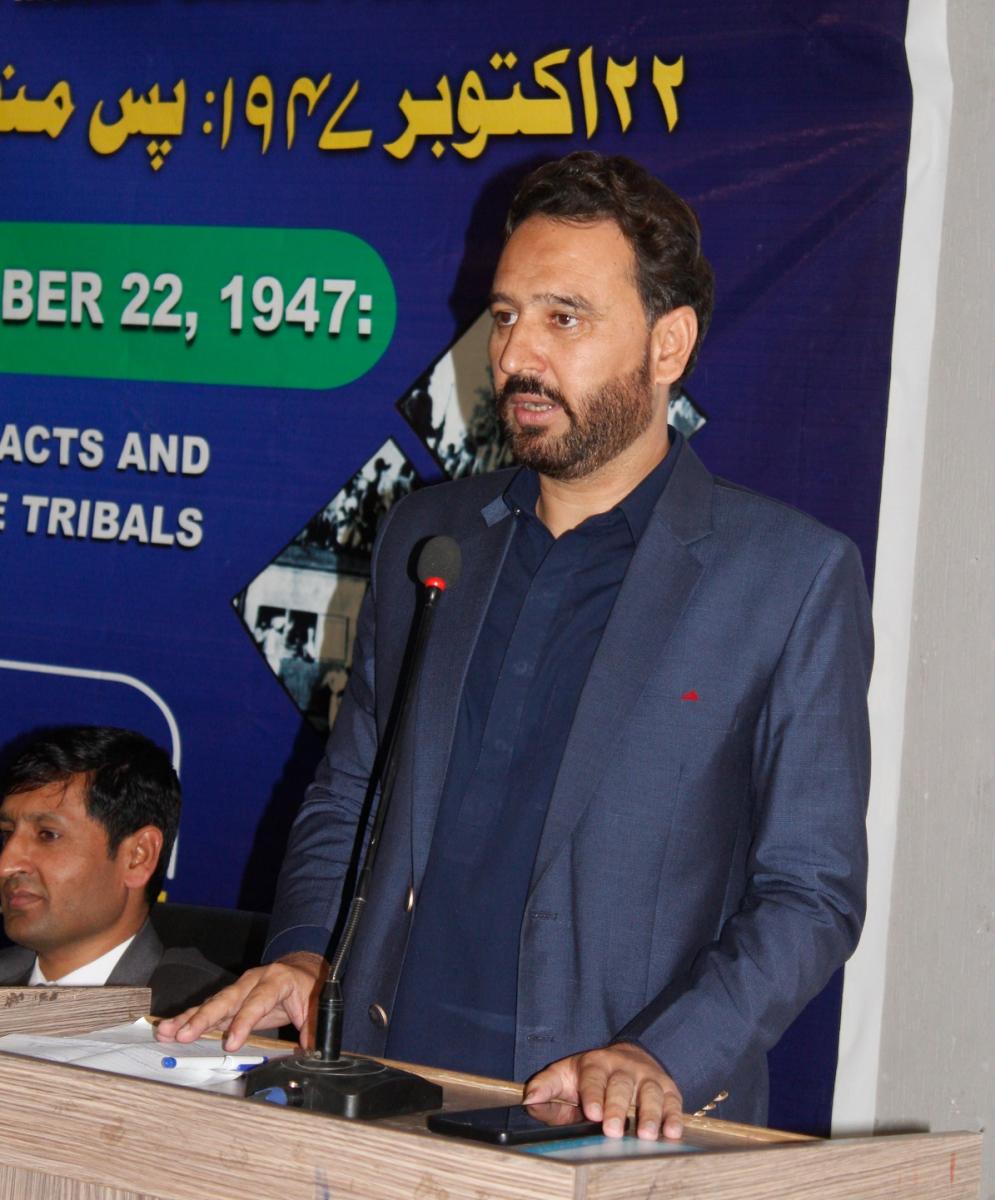 𝐃𝐫. 𝐌𝐞𝐡𝐦𝐨𝐨𝐝 𝐇𝐮𝐬𝐬𝐚𝐢𝐧, Head of the Department of International Relations, extended a warm welcome to the esteemed guests, speakers, faculty members, principal officers, and students. In his opening address, Dr. Hussain emphasized the significance of understanding the historical truths surrounding the liberation of Muzaffarabad and the critical role played by tribal forces. He urged the audience to reflect on the just struggle of the Kashmiri people against the brutalities of the Maharaja’s forces, RSS bandits, and the Patiala military contingent. A special documentary, produced by Mr. Asad Ali Baloch, was then presented, offering a visual narrative of the resilience and unyielding spirit of the people of Jammu and Kashmir.