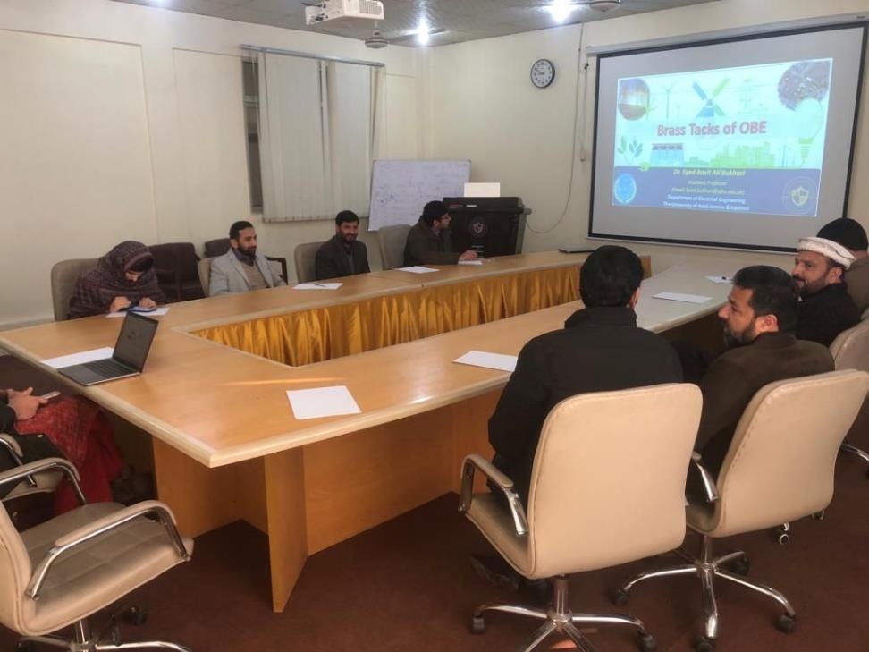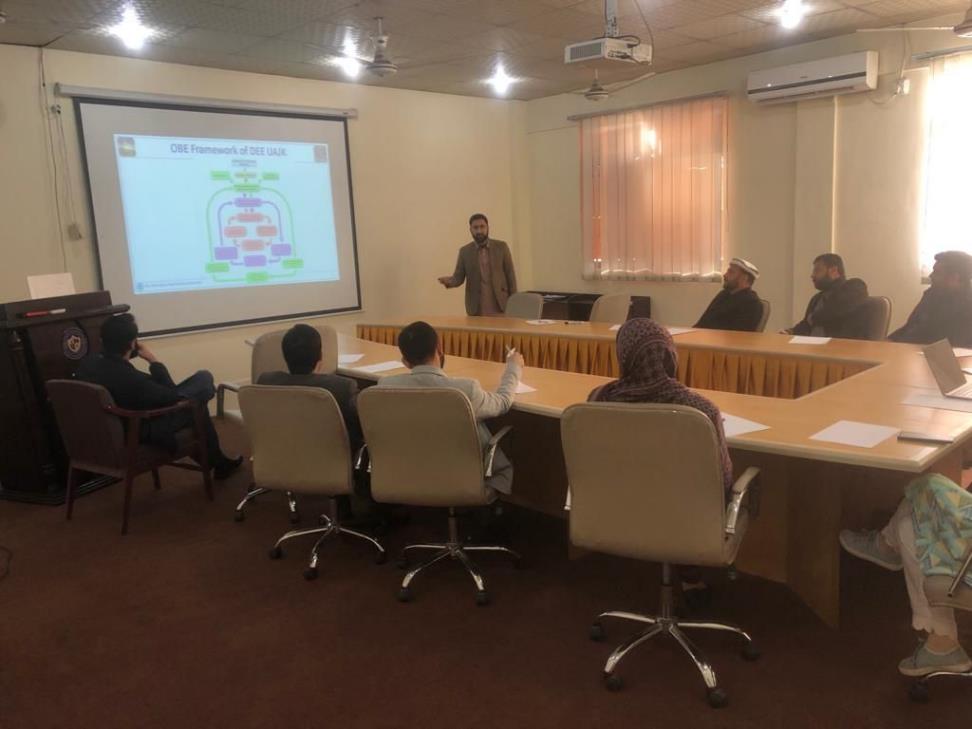 The Career Placement Office of the Department of Electrical Engineering, UAJK, organized a highly informative one-day workshop on “Brass Tracks of OBE” exclusively for the faculty members on November 22th, 2022. Led by the esteemed Dr. Syed Basit Ali Bukhari, Assistant Professor of the department, the workshop focused on providing faculty members with a deep understanding of Outcome-Based Education (OBE) principles and its effective implementation within the department. The workshop aimed to equip faculty members with the necessary knowledge and skills to effectively implement OBE in their teaching practices.