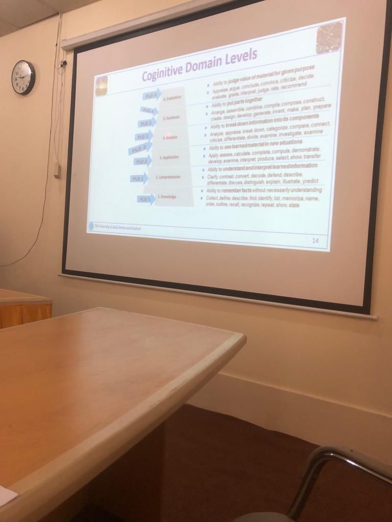 Additionally, the workshop highlighted the significance of Continuous Quality Improvement (CQI) in the context of OBE. Participants were introduced to the CQI process and its role in enhancing the educational experience for students. The workshop emphasized the importance of regular assessment, feedback, and evaluation to identify areas for improvement and make necessary adjustments to ensure the achievement of desired learning outcomes.