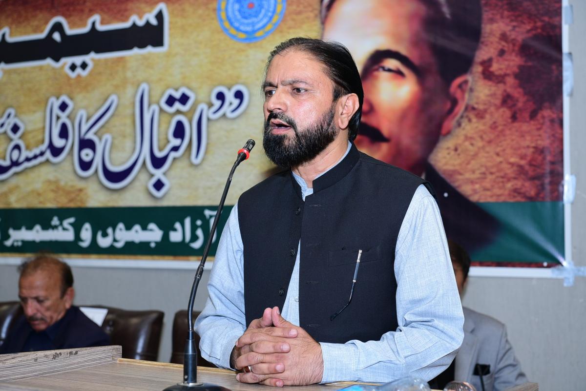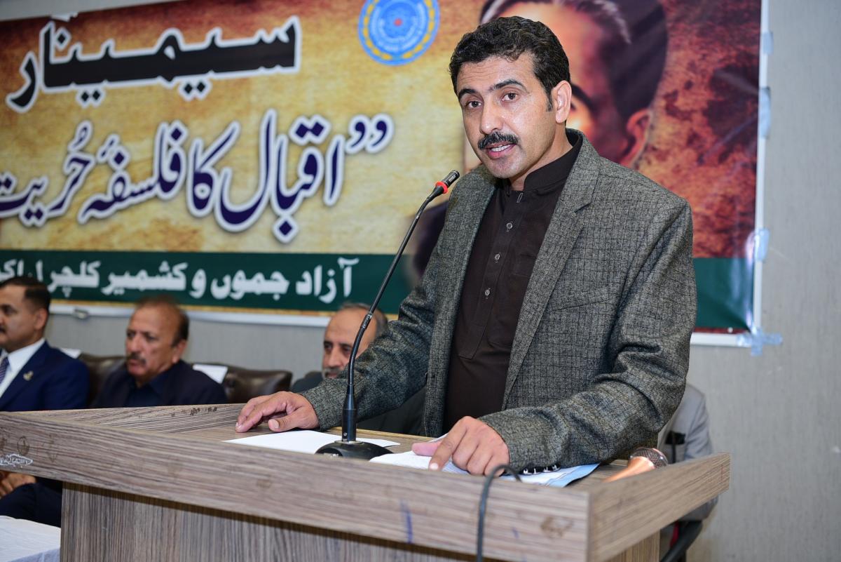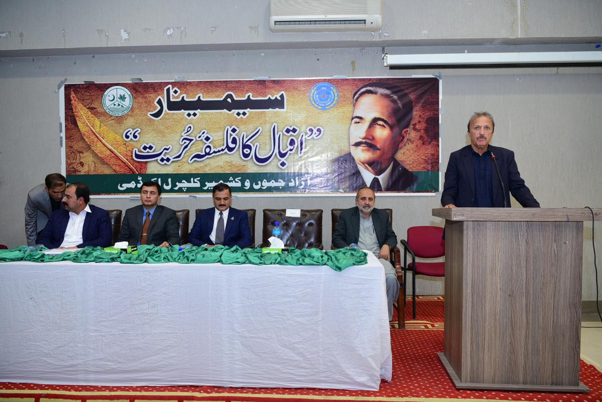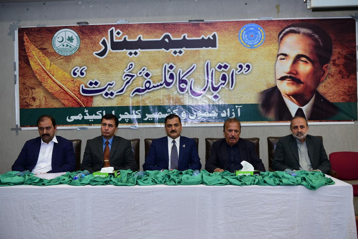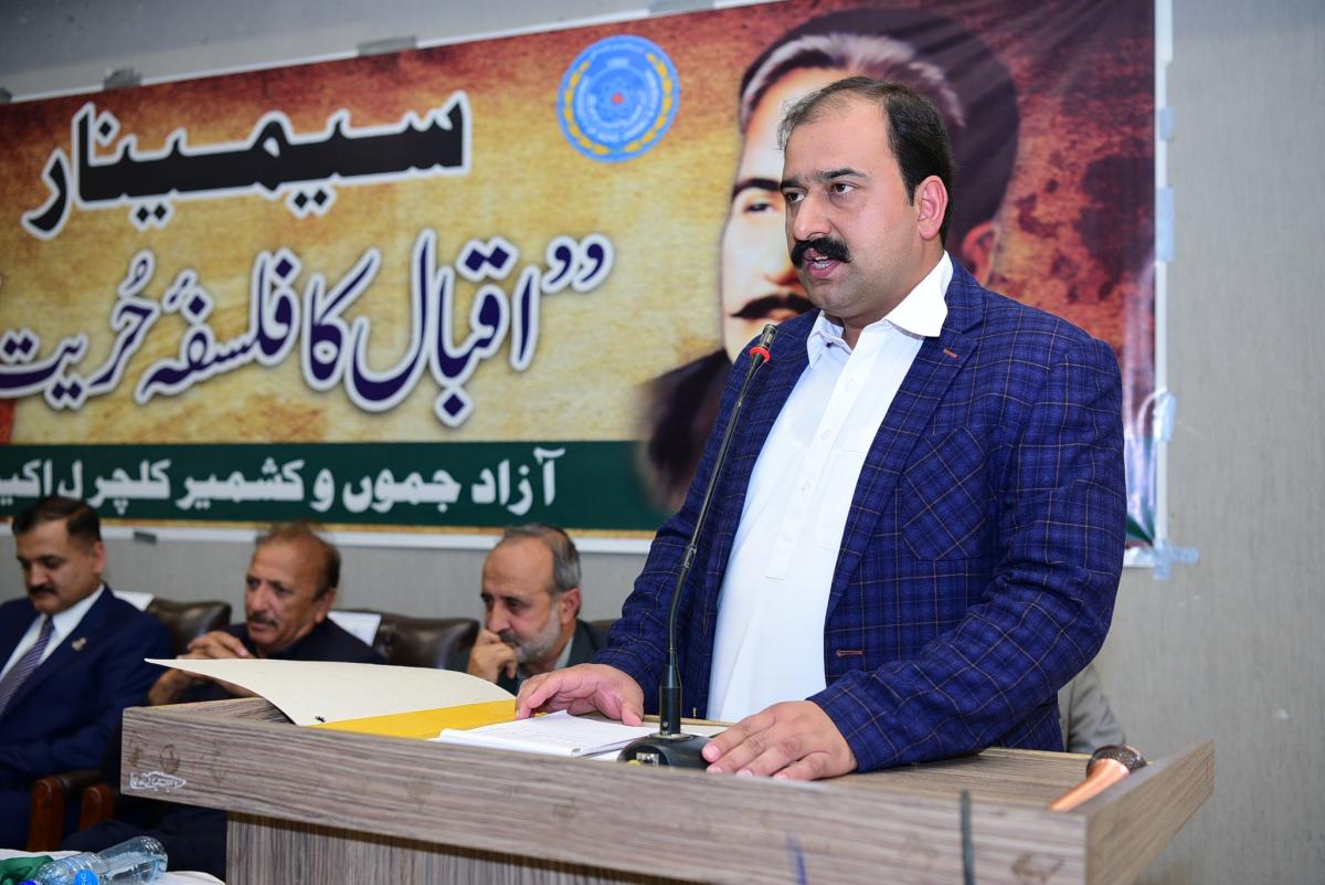 A heartfelt tribute was paid to the great thinker, poet, and philosopher Dr. Allama Muhammad Iqbal at a thought-provoking seminar organized jointly by the Kashmir Cultural Academy and the University of Azad Jammu and Kashmir (UAJK). Held in honor of Iqbal Day, the seminar titled “اقبال کا فلسلفہ حریت” took place at the Education Hall, Chella Campus.