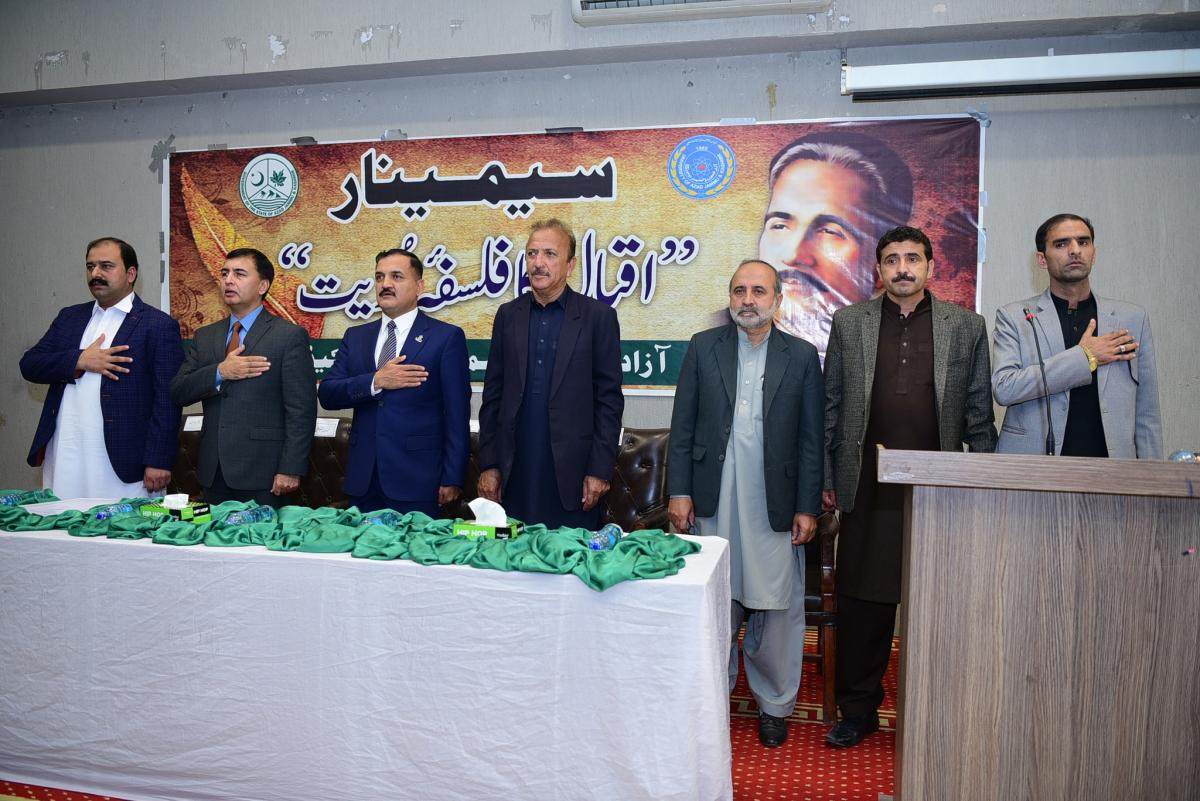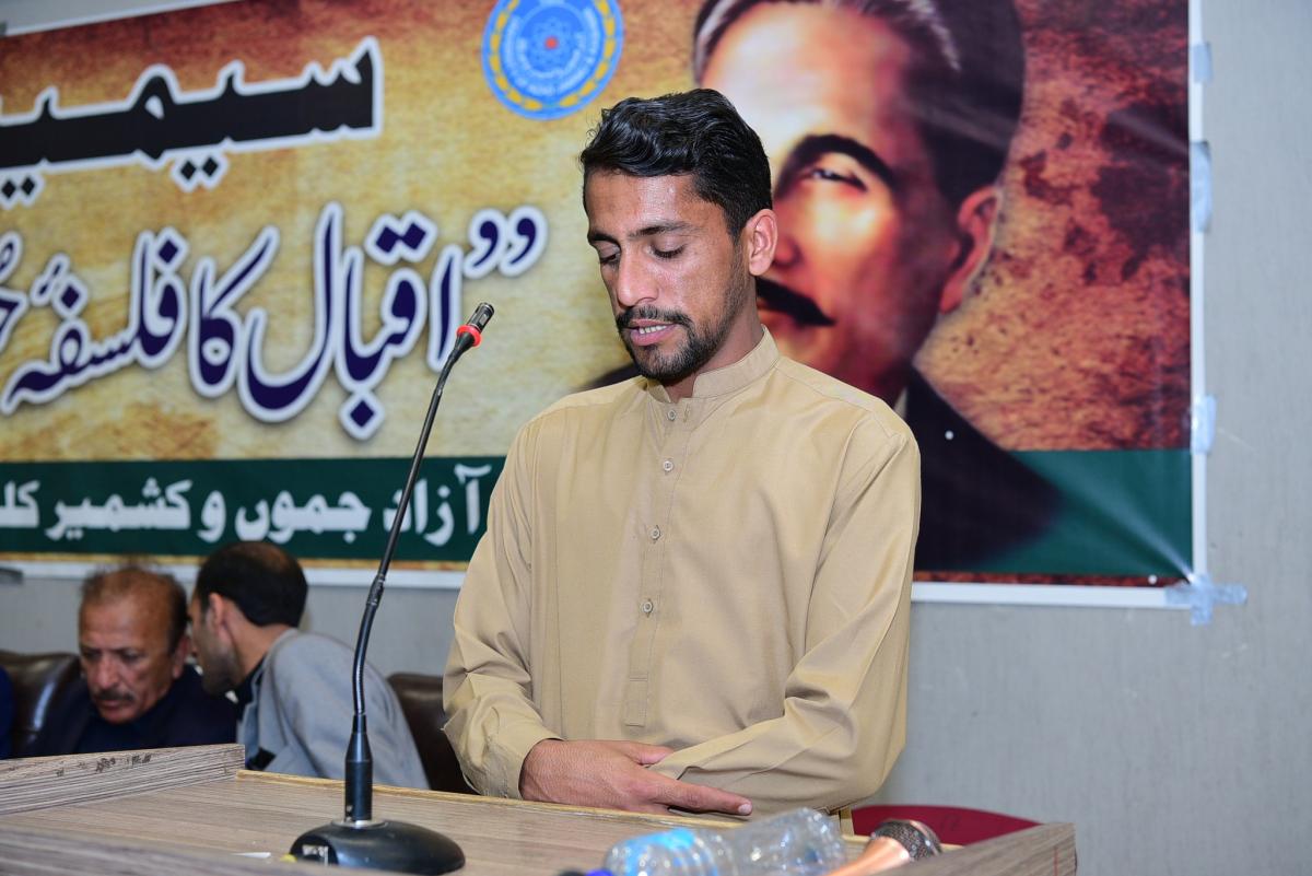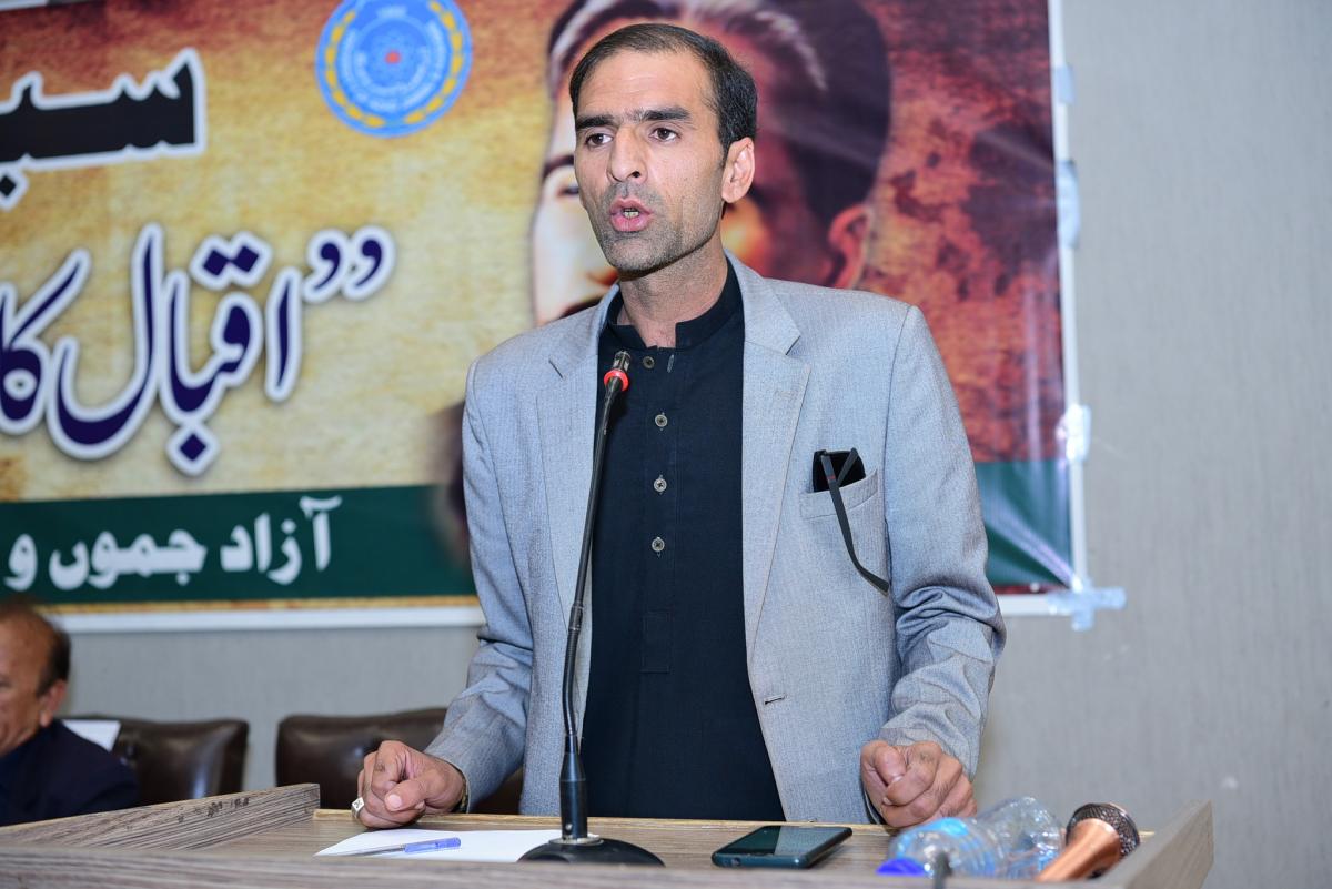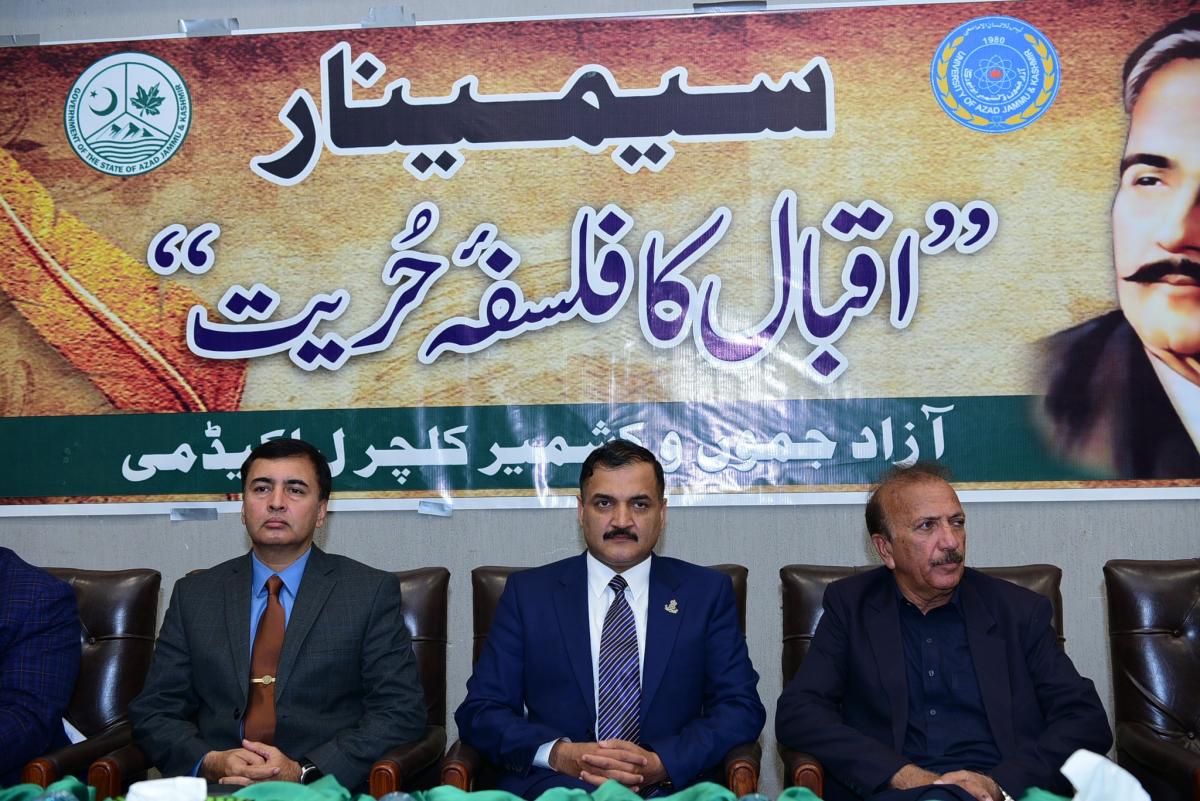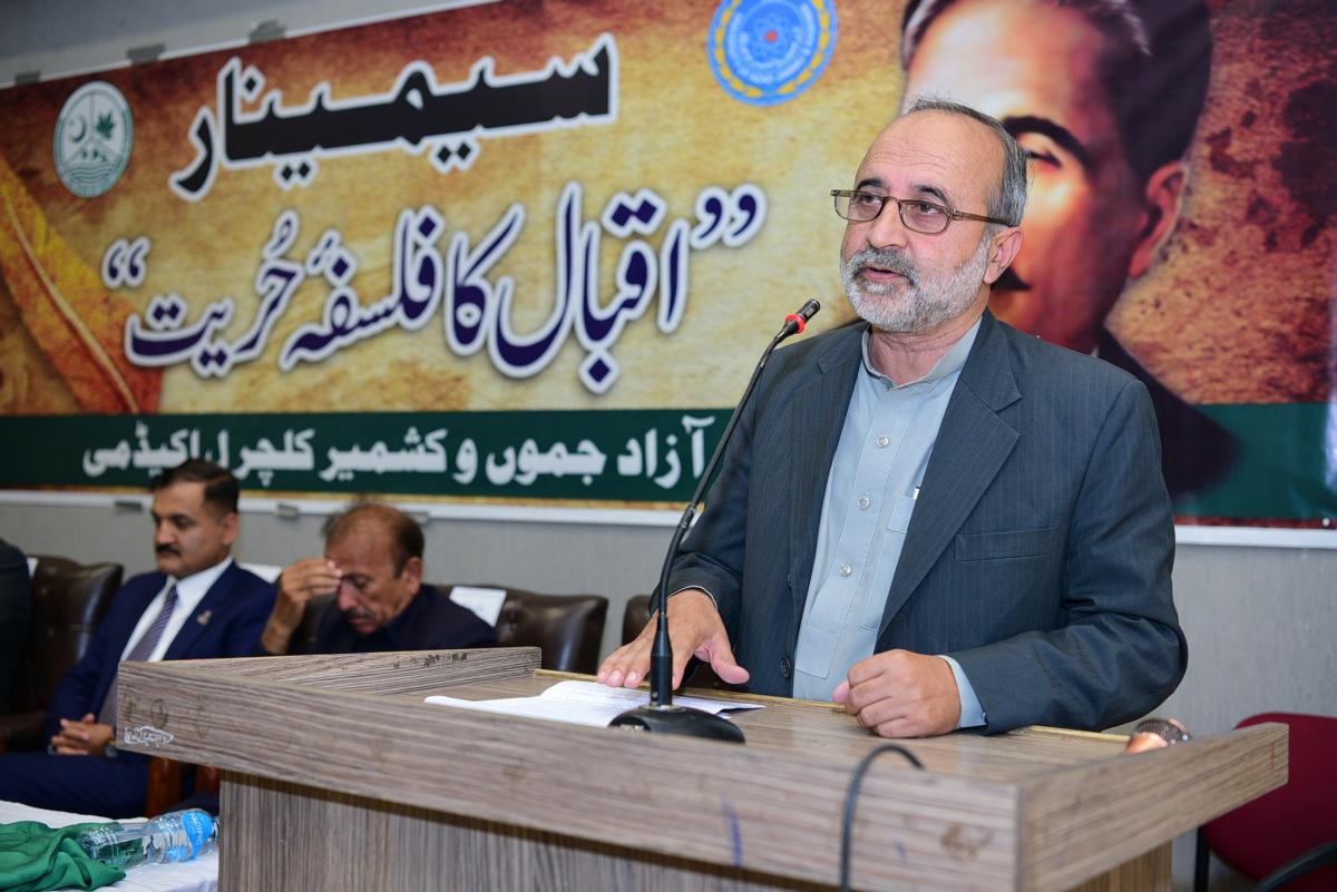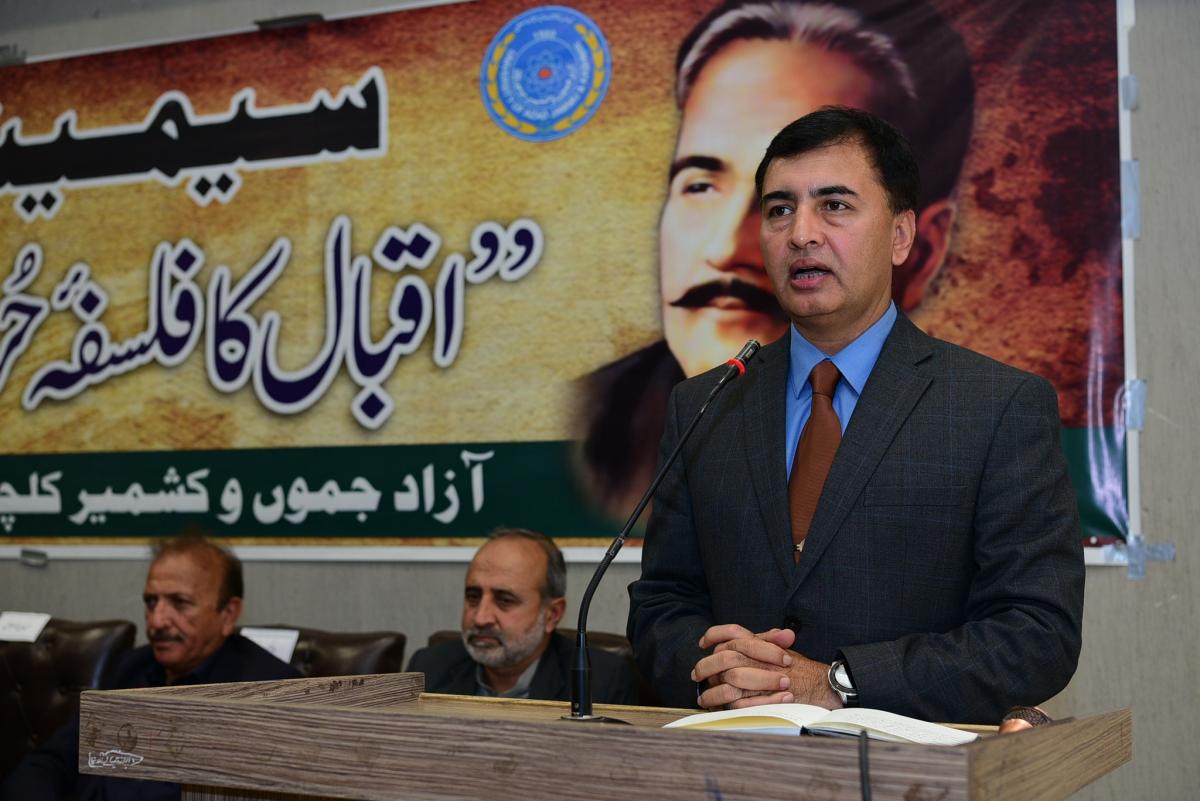 A heartfelt tribute was paid to the great thinker, poet, and philosopher Dr. Allama Muhammad Iqbal at a thought-provoking seminar organized jointly by the Kashmir Cultural Academy and the University of Azad Jammu and Kashmir (UAJK). Held in honor of Iqbal Day, the seminar titled “اقبال کا فلسلفہ حریت” took place at the Education Hall, Chella Campus.